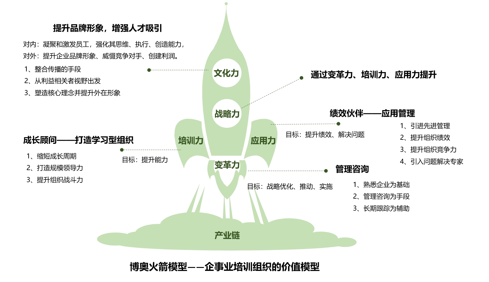 在企业培训平台建设初期,我们研发了一套火箭模型理论。明确了企业培训组织的三大价值:推动企业战略规划与实施,有效提升企业所在产业链的战略力;推动企业文化传承与再造,有效提升文化力;提升企业品牌形象、增强企业对人才的吸引力。提升价值的基础即为学习型组织的打造和学习后的应用实践。而博奥智库在学习型组织中拥有一站式学习资源,在应用管理过程中具备大量的运营案例,同时可以提供一定的咨询服务。真正为企业提供问题解决方案和实施落地。